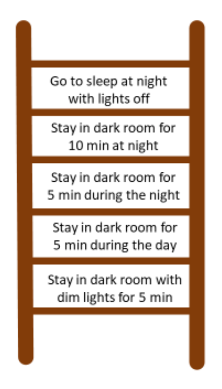 planned in advance and agreed upon by all parties. The child (and parent) should know what’s coming and should play a collaborative role in planning the exposures. This is often done by creating a “fear ladder” wherein the child, parent, and clinician determine a treatment goal (e.g., to be able to fall asleep alone with the lights off) which is at the top of the ladder, and then plan “steps” to reach that goal (in the form of gradual exposures).
